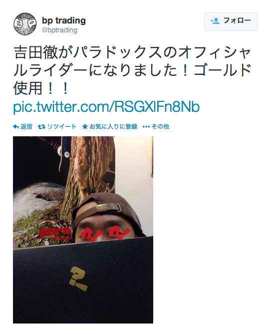 BLOG: TORU YOSHIDA T-19 タニ、Tightbooth オグ がライダーの… ──Paradox Griptape etc 2014.02.28 T-19 タニ、Tightbooth オグ がライダーの "Paradox" にサポートしてもらう事になりました。 自分好みのちょい荒めグリップテープです。 *追記:IPATH 中村久史、T-19 岩崎進吾、土谷敬志 もライダーです! Hard Zeiss × Xylee Herisog