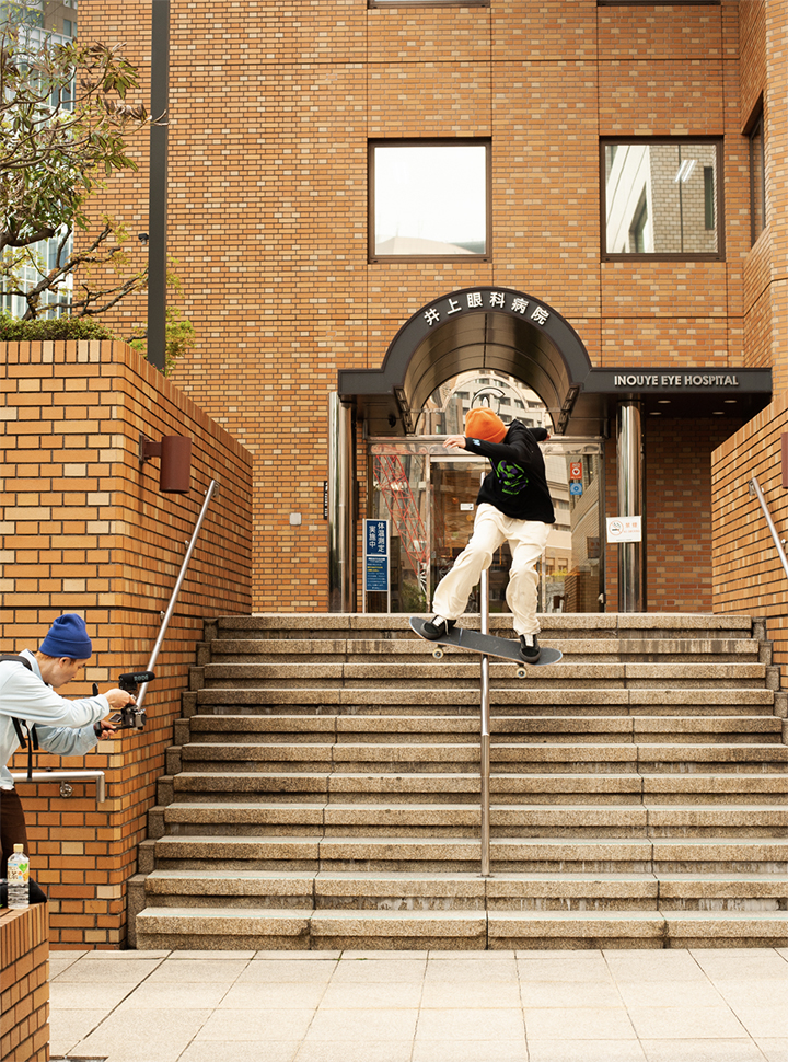 スポットを別のもう少し優しいハンドレールスポットに変更。レールは中級、キックアウトはかなり早いスポットなので「どうする?」と聞くと、「とりあえずフロントリップ」という答えが返ってきたのでお願いしてみるとハンドレールの滑り具合や角度をよくよく確認するわけでもなく、いきなり発射からの1発メイク! 理解が追いつかないし、多分キックアウトする側も気がついていないので、「んじゃあメイクしたらそのままラインで正面のステアまでいってなんかやってみれば?」というとさっきと寸分変わらないフロントリップドカーン! そのままその先にあるステアでバックサイド360クルクルドーン! そのままさっきキックアウトされたHellなレールに行くと、今度はバックサイドリップを2発でメイク。OMG! 今まで自分がしてきた撮影の常識がすべて崩れた瞬間でした。