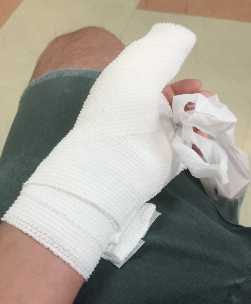 土曜日でもやっている近所の整形外科に行くと、先生がため息をついています。確かに目の前に蛍光灯で照らされているレントゲン写真はどう見ても様子がおかしい。「おおっと、顔が曇っている! どーした? マズイのか?」と僕の得意な「心の中ひとり実況中継」をしていると、先生から言われたのが「開放性骨折」。しかも親指の骨がバラバラに粉砕してて5分割くらいになっちゃってると。何がマズイかっていうと爪が剥がれて傷部分が中まで行っちゃってるから、無菌状態の骨とかに菌が入ると骨髄炎というかなり厄介なことに発展すると。そうなると指切断とかになっちゃうよって、えっっっっーーーー!?