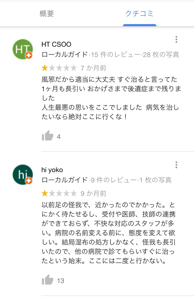 病室で暇なので、初めてスマホでこのコラムを書いてみることにしました。意外とスマホでも長文書けるんだなとか思いながら、ふと院長の名前をググってみるとGoogleの口コミ…「星ひとつつけるのも勿体ないくらいのクソ病院です。治したいなら絶対ここに行っちゃダメ!」