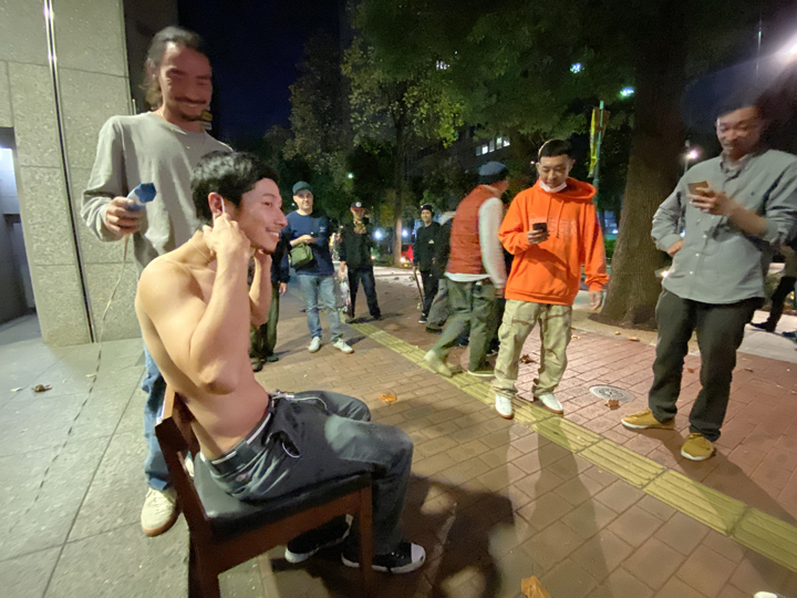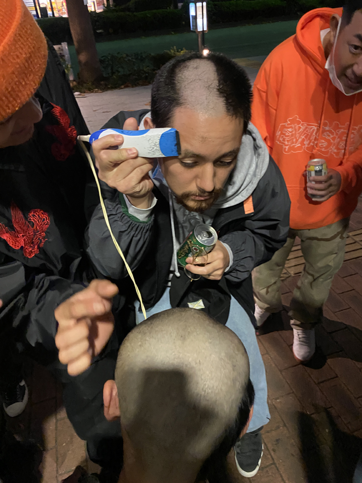 うわあ、負けちゃったよね〜って話なのですが、そのうち誰かが「やっぱ坊主じゃない? バリカン買う?」と始まります。ここにいる全員ほとんどが酔っ払っているので、最初から「負けたら坊主ね」という約束だったのか後から出てきた企画なのかは定かではありませんが、「やるぞー!!」という全員のヴァイブスは高め。何か楽しいことがあればそれでいいという我々にとってはストリートで坊主なんて、これ以上のエサはありません(笑)。