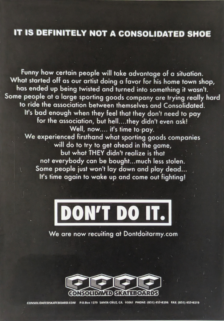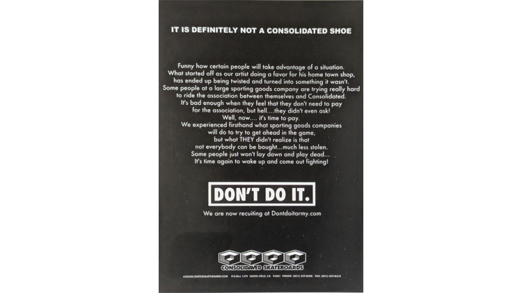 この時点でConsolidatedは大企業のスケート業界参入を快く思っておらず、この段階でDON’T DO IT.のスローガンが出来上がっています。その証拠として、1997年にConsolidatedによるDON’T DO IT.というスローガンの商標権出願が行われています(trademarks.justia.com/754/05/don-t-do-it-consolidated-skateboards-75405244.html)。