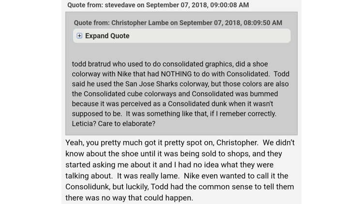 そして、Consolidated側は発売後に初めてこのDunkの存在を知ることになったそうです。Slapの掲示板でConsolidatedの創設者のひとりであるレティシア・ルアーノが当時の心境として「Nikeとのコラボについてはショップから問い合わせがあるまではまったく知らなかった」と書き込んでいます。