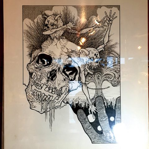 国際的なアーティストとして知られるPUSHEAD。独自のスタイルで描くスカルモチーフのアートワークが特徴で、世界各地にフォロワーが存在します。スケートボーダー、ハードコアパンクバンドのシンガーとしての顔を持ち、'80年代にThrasherやZorlacに提供した数々のアートワークはあまりにも有名。アートを通じて多ジャンルへのクロスオーバーを牽引した代表的なアーティスト。写真の作品は某氏所有の原画(!!)で、日本のあるレジェンドハードコアバンドのアルバムカバーになる予定だったものだとか!?