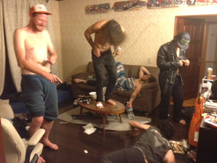 今回のトリップは日本通のRie(6回目)を除き、日本は全員始めて。アジアの他国も誰も経験していないため、アジア自体が始めて。アメリカ大陸、ヨーロッパ大陸しか経験していない彼らにとっては日本で見るもの、聞くもの、食べるものほぼすべてが初体験。何でも出されたものを食うやつ、一応聞いたりしながら探りながら食うやつ、かなりアホな理由でベジタリアンになり野菜しか食べられないやつ。屋外で酒が飲めること(アメリカではダメ)に興奮して飲みまくる奴(全員)。一日中上半身裸で過ごす奴(Jerry)、飲み過ぎて仲間割れ、号泣、仲直り、顔面パンチ、ガラス破損、スナックで激飲み&メタル熱唱、珍○露出、キックアウト、ホームステイ、ありとあらゆることが起こった2週間で、うちに滞在していたのが大体11日間。その間に出た酒のゴミはビールの缶約300本以上、ウィスキーのボトル1○数本、鬼殺し紙パック20パック以上。山形でお世話になった寒河江スケートパークのみなさんの計らいで連れて行ってもらったスナックでの飲み代は、一体いくらだったのか想像するのも恐ろしいくらいです。