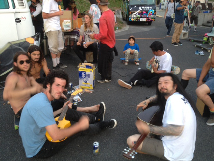 こんなにも臭くて、ウルサイ奴らなのにどこへ行っても大歓迎されました。とにかくスケボーしまくるのと、アホなのと、そして人当りがとてもいいのでもの凄い人気ぶりでした。デモのような形ではなくローカルとのセッションに重点を置いて行ったトリップだったので、一緒に滑るチャンスに恵まれた ローカルスケーターたちは、今まで出来なかったトリックがその日に出来るようになった人もいたようです。さらに彼らのスキルはスケボーだけではなく、そのメタル的な風貌からも分かるように楽器の技術がもの凄いのです。寒河江では仙台から来た怖い人と即興ジャムセッションが開かれ、スケボー終了後も大いにパークを盛り上げていました。こんな調子でどこへ行っても必ずローカルとセッション。大物ぶることなく(実際大物ではないのですが)、謙虚な姿勢で大騒ぎ。謙虚なのにドアホ。謙虚に大酒。面白過ぎです。