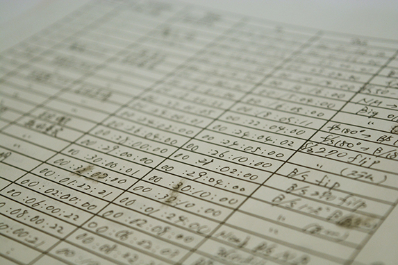スケートの撮影ではオンオフをこまめに行うし、アングルチェックで何度も確認するからタイムコードが特に切れやすい。はじめは “タイムコードが切れる”ということをまったく意識していなかった。編集の前段階作業として「タイムコードの書き起こし」という作業がある。テープのどの位置にどんな映像が入っているのか。本当にアナログ的で究極にミニマムな作業だけれど、意外と慣れると時間を忘れる程に没頭できる作業でもある(雨の日なんかはこの作業をするのに最適かもしれない)。この時はこんなこと考えてたな、もっと良いアドバイスできたな、なんて思いながら進めていくと、時には思いもよらなかった掘り出し映像なんかにも出会えることもしばしば。100本以上のテープを作業していると、タイムコードが切れる度に「00:23:33_タイムコード切れ」と備考欄に入れ、00:00:00からまた書き起こしが始まることになる。何度も切れると結局どこにどの映像が入っているかがまったく分からなくなってしまう。この作業を行うと撮影する時にタイムコードが切れると巻き戻してタイムコードをつなげたくなる。テープを撮り終わってタイムコードが01:02:00を越えていると「良し」という気持ちになる。
