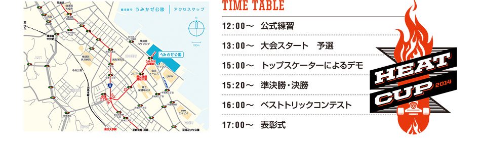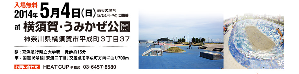 来る5月4日(日)に横須賀・うみかぜ公園にて、現場のスケーターの声をフィードバックした スケートイベントが開催される。日本屈指のスキルを誇るスケーターたちが集結し、特設された ストリートセクションを用いてジャムセッション形式で勝ち上がっていくストリートコンテスト。 スケートあり、BBQあり、音楽あり、高額賞金あり、スペシャルゲストありの GW最大のスケートボードの祭典。 5月4日はファミリー総出で、HEAT CUPをおもいっきり楽しんじゃいまSHOW!!