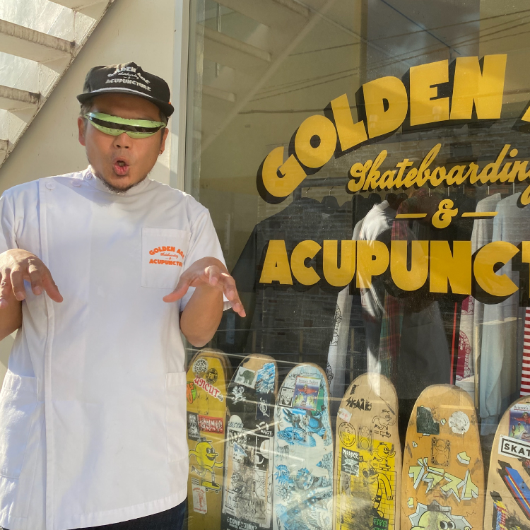 鍼灸接骨院とスケートショップが融合した個性派店舗、GOLDEN AGEを営む鹿児島大資。スケーターの身体からギアまでをトータルでサポート中。