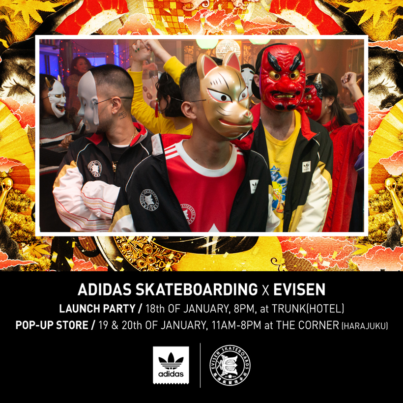 adidas SkateboardingとEvisenのコラボコレクションのローンチパーティが1月18日(金)に渋谷・TRUNK HOTELで開催。