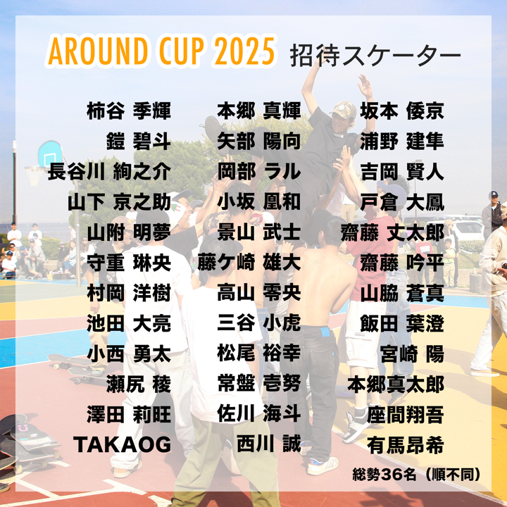招待スケーター:座間翔吾、本郷真太郎、有馬昂希、柿谷季輝、鎧 碧斗、長谷川絢之介、山下京之助、山附明夢、守重琳央、村岡洋樹、池田大亮、小西勇太、瀬尻 稜、澤田莉旺、TAKAOG、本郷真輝、矢部陽向、岡部ラル、小坂凰和、景山武士、藤ケ崎雄大、高山零央、三谷小虎、松尾裕幸、常盤壱努、佐川海斗、西川 誠、坂本倭京、浦野建隼、吉岡賢人、戸倉大鳳、齋藤丈太郎、齋藤吟平、山脇蒼真、飯田葉澄、宮崎 陽