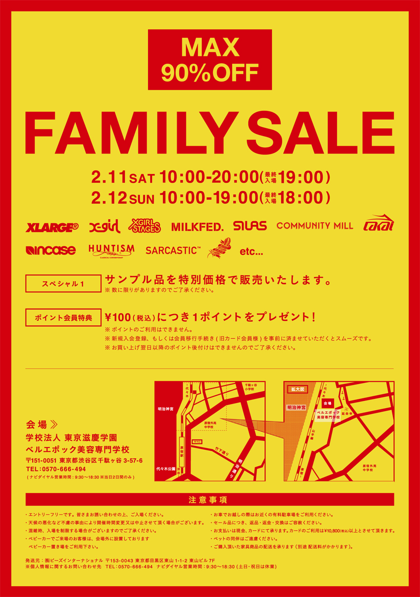 LakaiやXLARGE®、incaseなどを取り扱うB’s Internationalのファミリーセールが2月11日(土)、12(日)の2日間で開催。