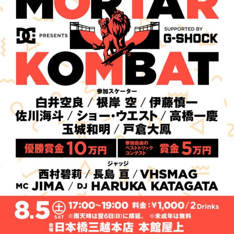 日本橋三越の屋上にミニランプを設置して行われるイベント“Mortar Kombat”が8月5日(土)に開催。都会のど真ん中、開放感のある屋上での開催は盛り上がること間違いなし。
