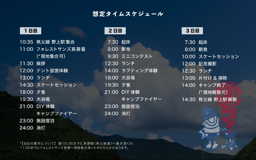 Elementライダーを講師に招き、2泊3日でキャンプをしながらスケートの技術を習得。
