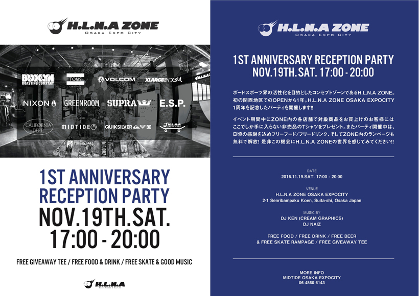 ボードスポーツの活性化を目的として大阪Expocity内に展開するH.L.N.A ZONEの1周年を記念したイベントが開催。