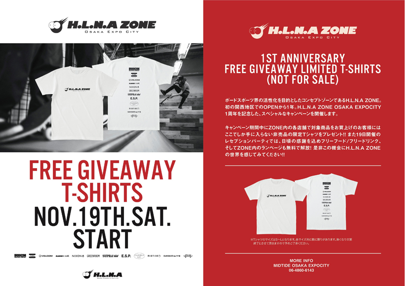 また19日以降にH.L.N.A ZONEの各店舗で対象商品を購入すると先着で非売品のTシャツがもらえるというキャンペーンを展開。