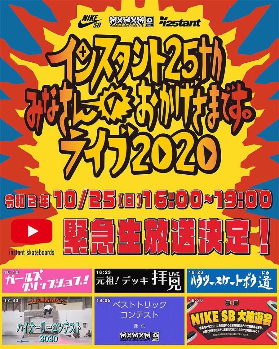 instant設立25周年企画『インスタント25th みなさんのおかげです。ライブ2020』が10月25日(日)16:00にYouTubeにて緊急生放送。