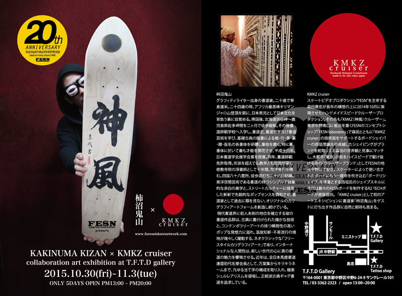 スケートビデオプロダクション"FESN"を主宰する森田貴宏が長年の構想の上に2014年10月に実現させたハンドメイドスピードクルーザープロダクション。その名も「KMKZ(神風)クルーザー」。 東京中野南口に拠点を置くFESNのコンセプトショップ「FESN laboratory」で森田とともに「KMKZ cruiser」の技術面をサポートするボードシェイパーの西垣茂雄氏の卓越したシェイピングがブランドを舵取りする森田の世界観と見事にマッチし、大都市「東京」の街をハイスピードで駆け抜ける為の「クルーザーブランド」としてFESNの地元中野にて設立。 スケーターによって使い古されたボードにもう一度命を吹き込む「ボードリシェイプ」を得意とする西垣氏のシェイプスキルに今回は数々のFESNボードを制作するR2 TECHボードが原版提供。「KMKZ cruiser」として初のアートエキシビションに書道家「柿沼鬼山」をゲストに打ち出す作品群に自然と期待も高まる。