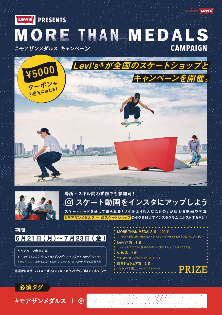 当選者のなかから100名に参加スケートショップで使用できる¥5,000クーポンをはじめ、1年分のLevi’s®ジーンズのサポートやVHSMAGのデッキといった懸賞も用意。