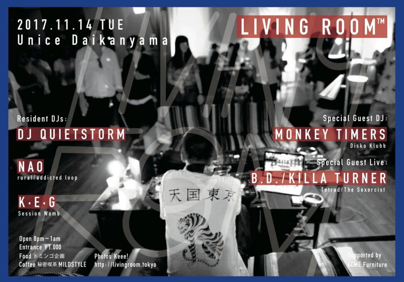 クラブのフロア中心に置かれたソファに座りリラックスした姿勢でDJを行うイベント“Living Room”が11月14日(火)に代官山Uniceにて開催。