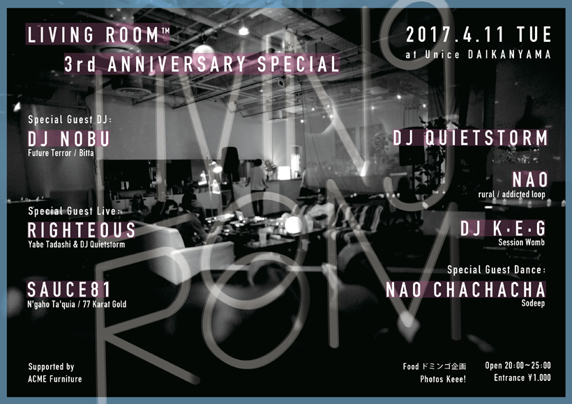 フロア中央のソファにDJが座り、お客さんに囲まれながらDJを行なうという画期的なイベント“Living Room™”の3周年記念パーティが4月11日(火)に開催。