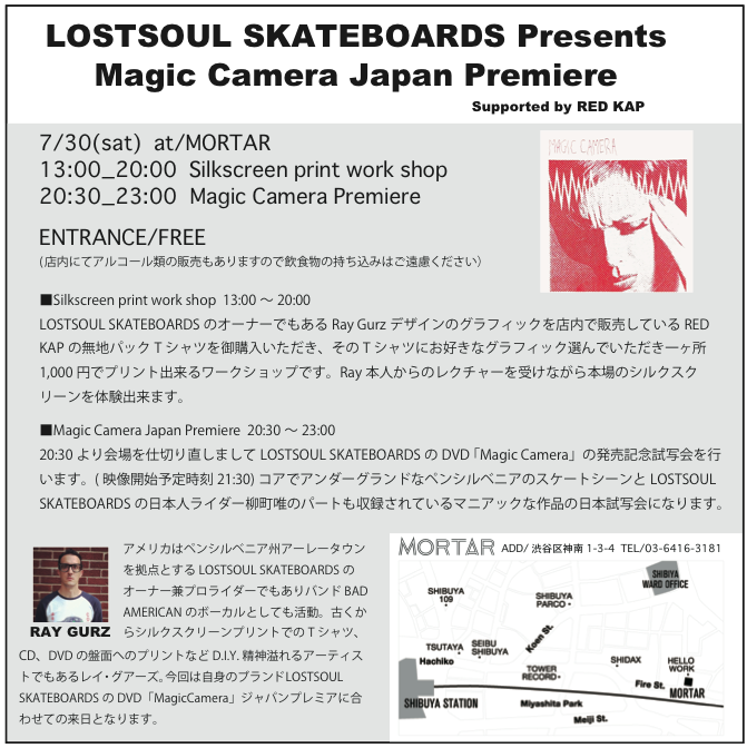 Lostsoul Skateboardsの新作DVD『Magic Camera』のジャパンプレミアに合わせ、同ブランドのオーナーであるレイ・ガーズが手掛けるグラフィックをチョイスし、Mortarで販売しているRed Kapの無地Tシャツにプリントするというワークショップが開催。