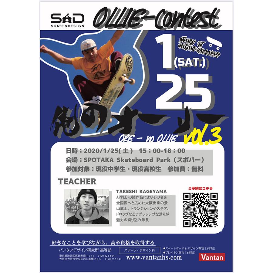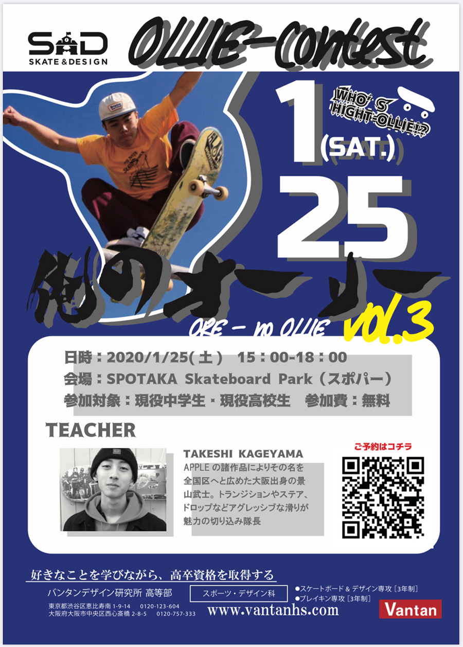 バンタンデザイン研究所 高等部 大阪校 スケートボード&デザイン専攻によるイベント“俺のオーリー Vol. 3”が1月25日(土)にスポパーにて開催。