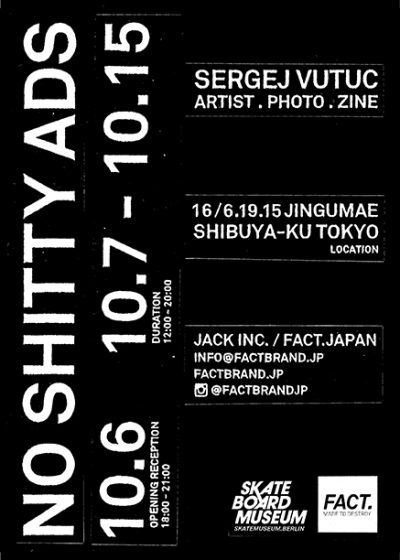Skateboardmuseum Berlinのキュレーターを務めるユルゲン・ブリュームラインとアーティストのセルゲイ・ヴトゥックを迎え、FACT.プレゼンツのNO SHIITY ADS展が渋谷16 (Sixteen)にて開催。