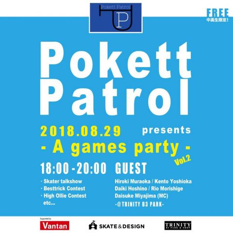 バンタンデザイン研究所高等部スケートボード&デザイン専攻に在学中の吉岡賢人が手がけるマンスリー動画企画“Pokett Patrol”による中高生限定のイベントが8月29日(日)に東京・板橋のTrinityにて開催。