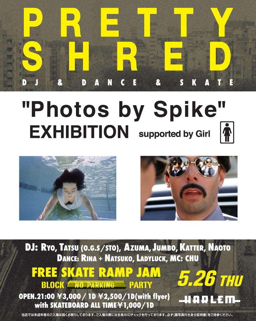 渋谷Harlemで毎月第4木曜日に開催されるイベント、Pretty Shred。フロアにミニランプを設置し、自由にスケートが楽しめるこのイベントにスパイク・ジョーンズの写真展がジョイント。