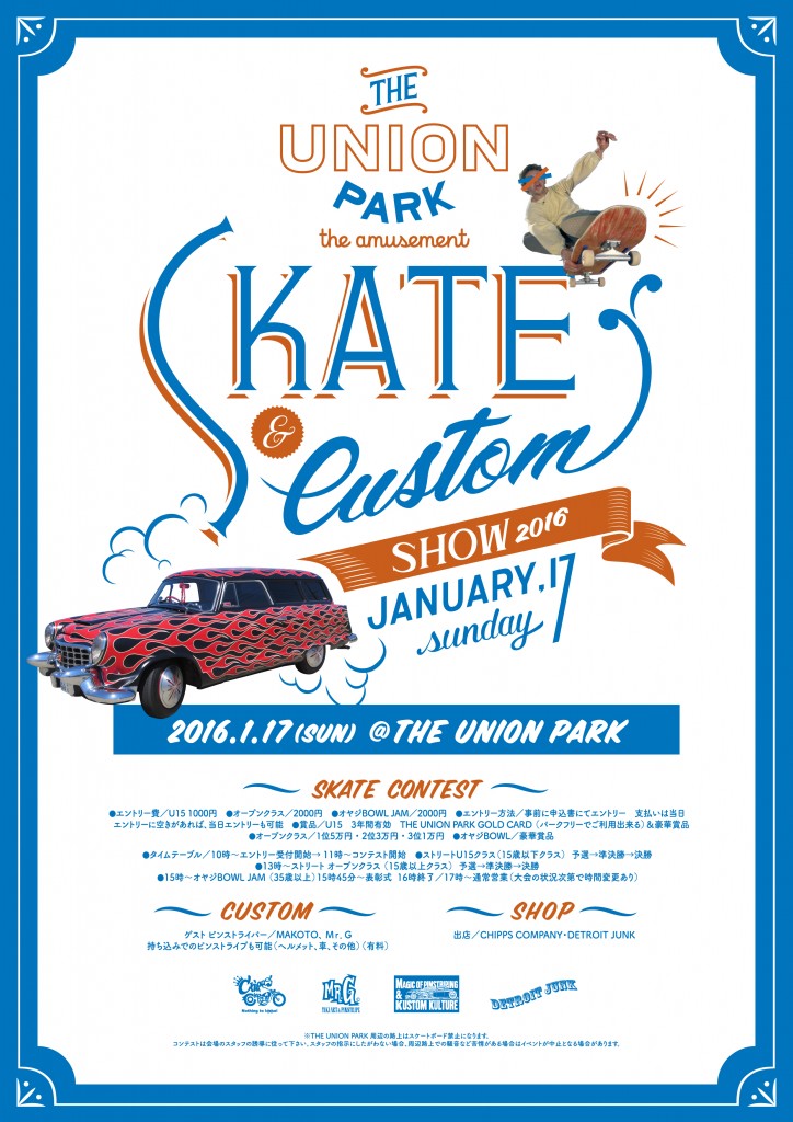 2016年1月17日(日)に千葉のTHE UNION PARKにてスケートボードのコンテストとカスタムカーショーがセットになったイベント“Skate & Custom”が開催