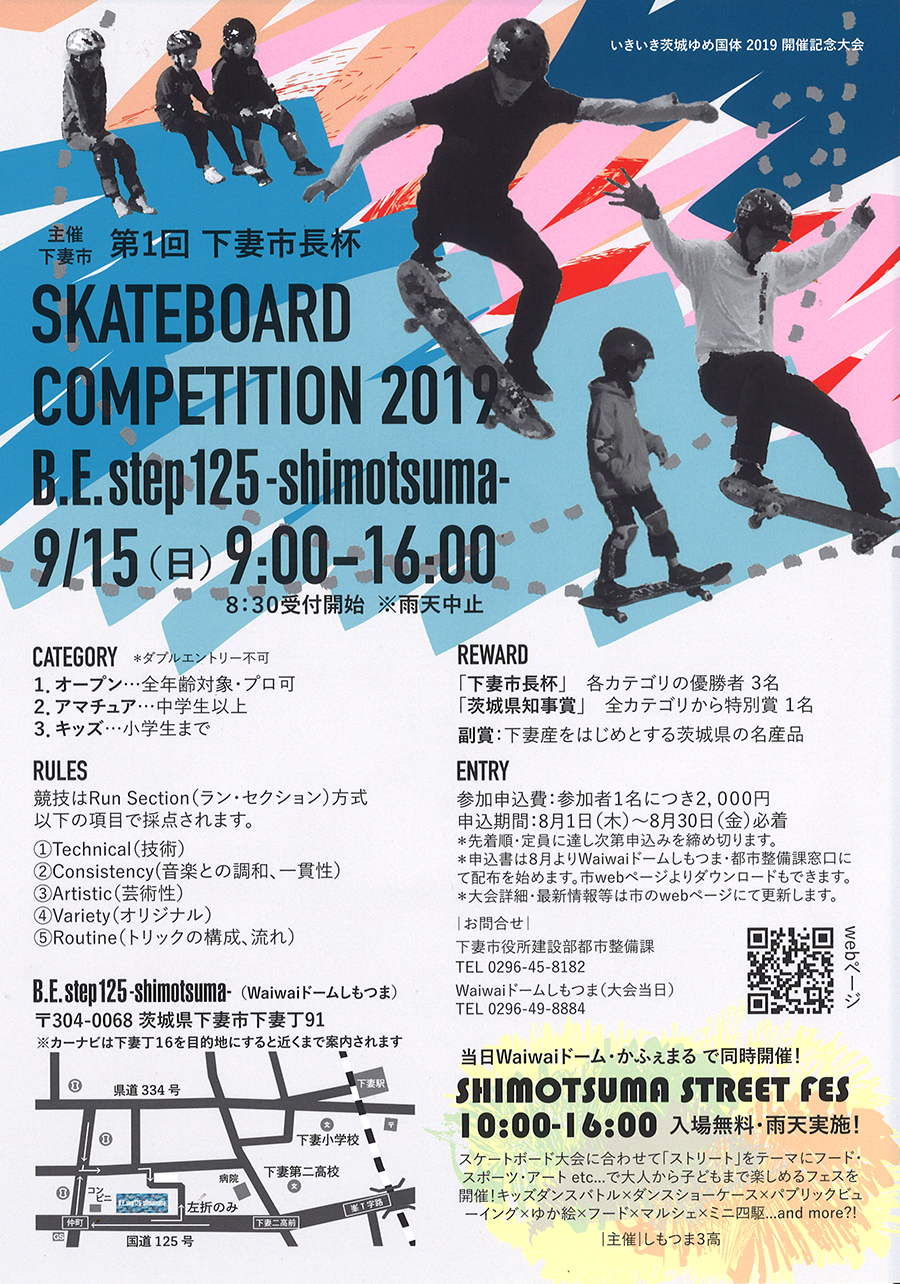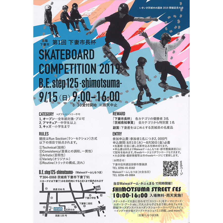 9月15日(日)に茨城・下妻のWaiwaiドームしもつま内スケートパーク「B.E.125-shimotsuma-」にて、第1回スケートボード下妻市長杯 2019いきいき茨城ゆめ国体開催記念大会が行われる。