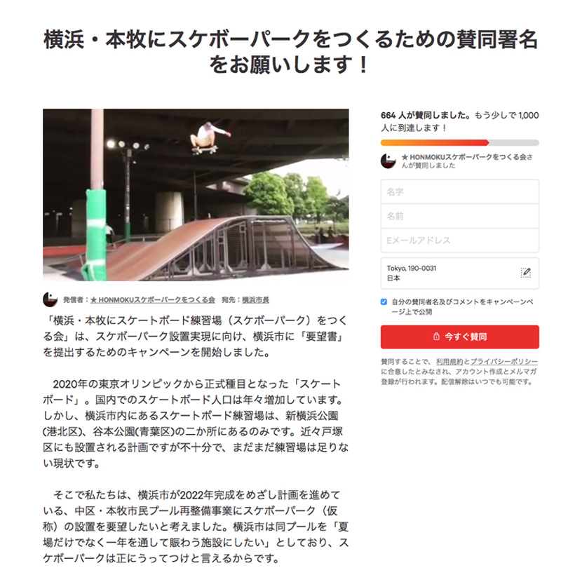INFO / EVENTS 横浜市中区・本牧市民プール再整備事業にスケートパークをつくる署名活動を… ──横浜・本牧にパークをつくるための賛同署名 2018.10.18 横浜市中区・本牧市民プール再整備事業にスケートパークをつくる署名活動を田中晶悟が中心となって行っております。 スケーターが手を取り合ってパークの設置実現のために頑張ろう! ということで、賛同や署名はこちらのページから。