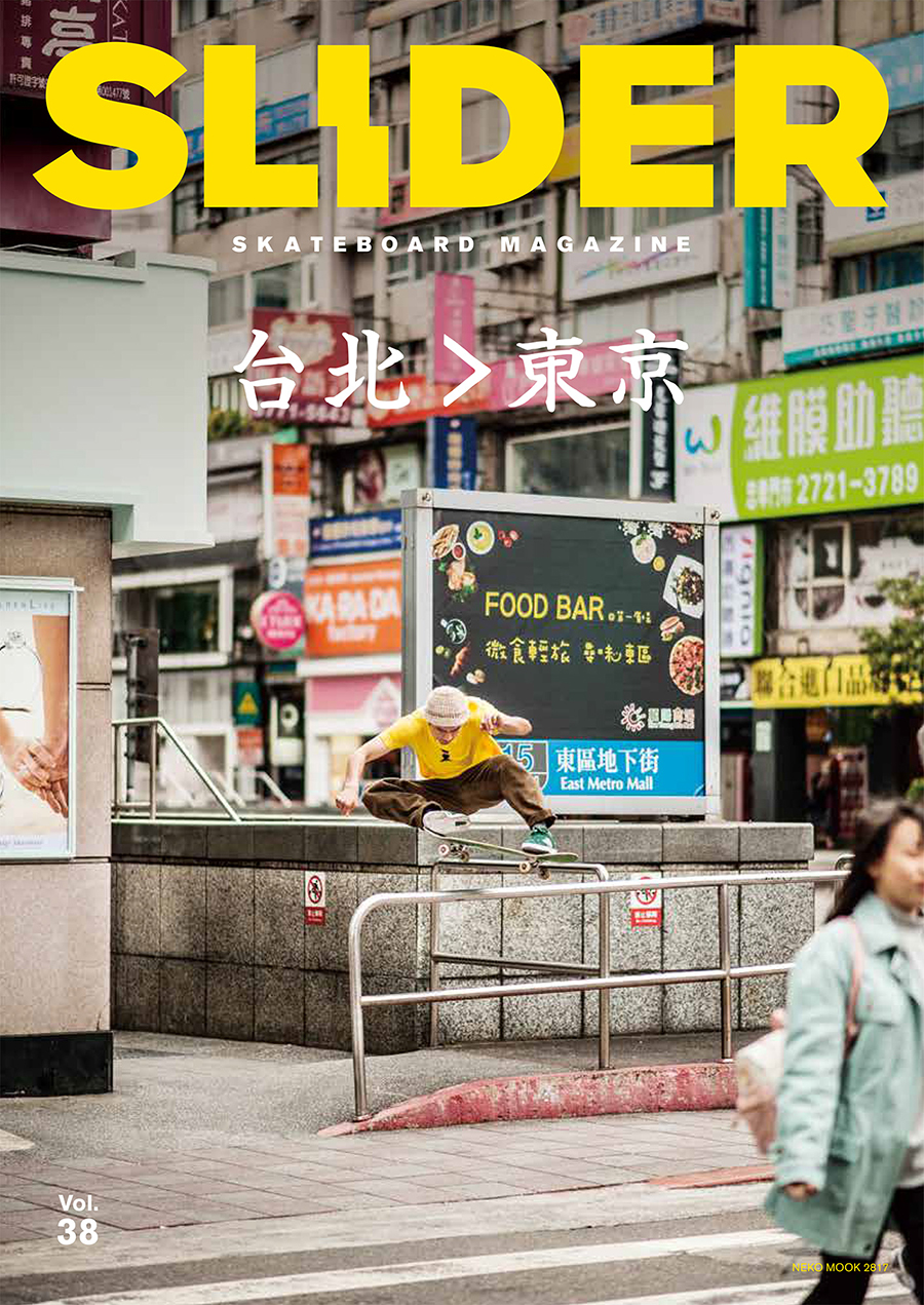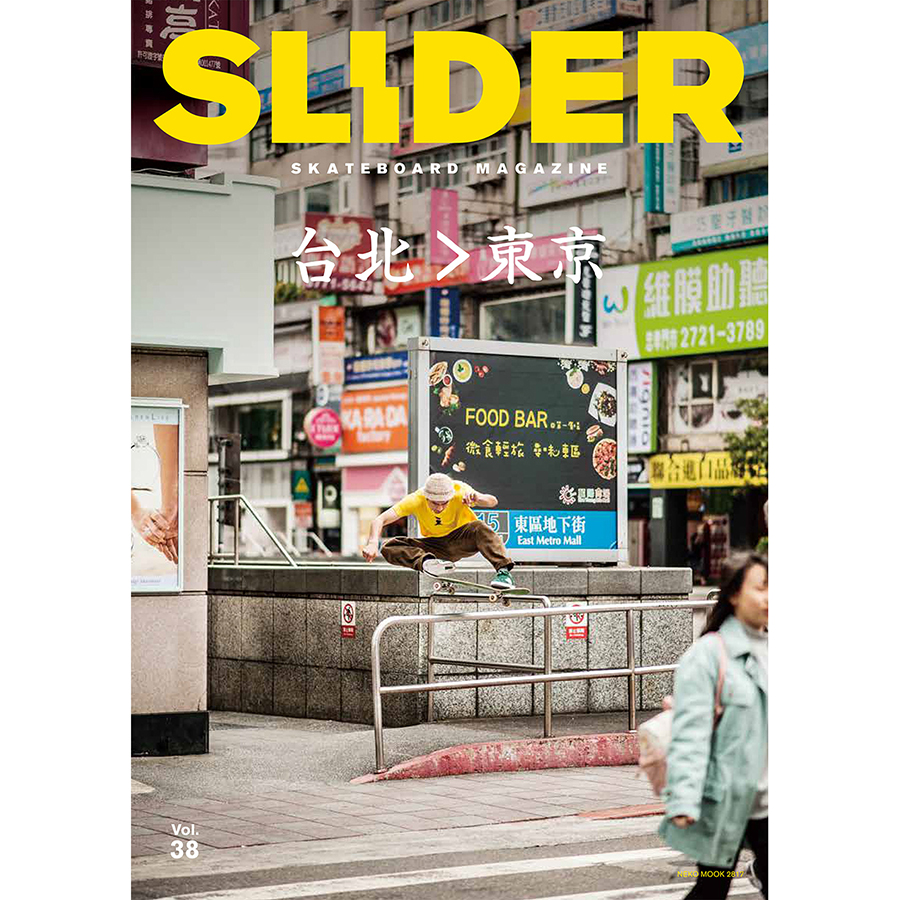 スケートボード誌SLIDER Vol. 38が3月30日(土)に発売。今号の目玉企画は台北で撮り下ろした村岡洋樹の特集に加え、キーパーソンやショップ・スポットなどにスポットライトを当てたスケーターのための裏・台北ガイド「TAIPEI KNOWS」。さらにはDogtownのジム・ミュアー、DCのジョシュ・ケイリス&マイク・ブレイバック、Brixtonのブライアン・デラトーレ&ドーラン・スターンスのインタビュー、そして豪華面子のグラビア企画CHAOSなど充実した内容。