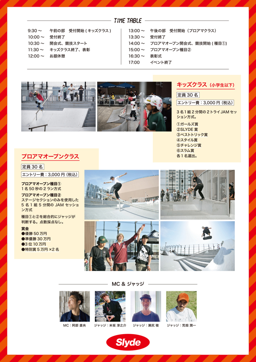 ガールズ賞、SLYDE賞、ベストトリック賞、スタイル賞、チャレンジ賞、スラム賞を各1名ずつ選出。入賞者にはSLYDEのプロダクトを贈呈。