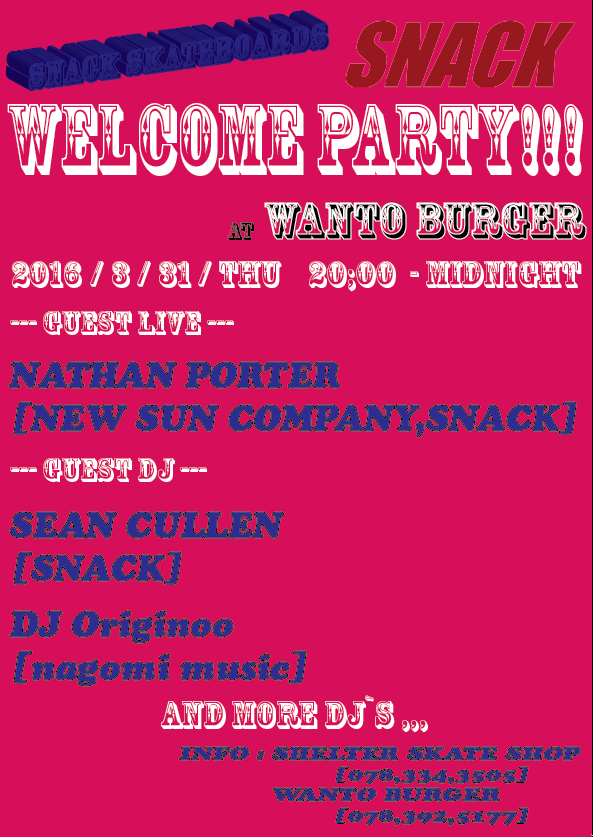 3月27日(日)には横須賀のours skateboard&Co、31日(木)には神戸のShelterプレゼンツのウェルカムパーティが開催。