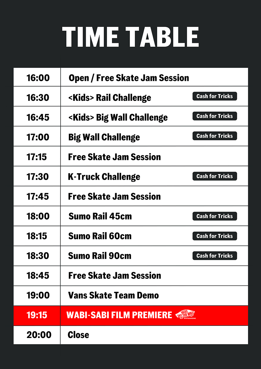 当日は特設セクションでの誰でも参加可能なスケートジャム、イベント限定グッズの配布、Vansのポップアップストアなど盛りだくさん。