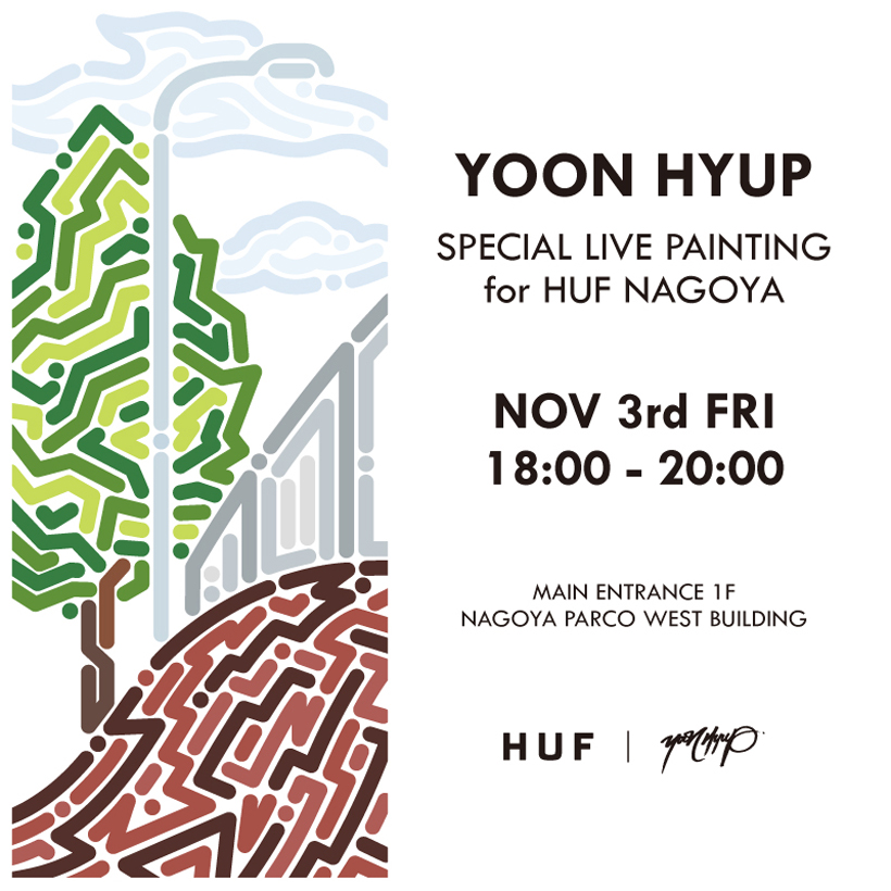 また、11月3日(金)に行われるHUF NAGOYAの1周年記念パーティでは両者のコラボコラクションが展開されるほか、ライブペインティングを披露。