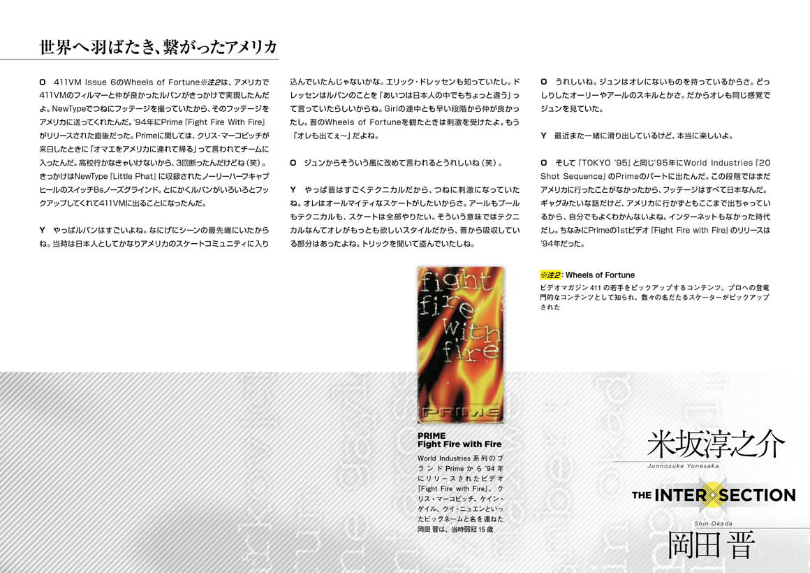 日本のスケート史にその名を刻むパイオニアそれが米坂淳之介と岡田 晋である。’90年代半ばにNEWTYPEの一員として日本のスケートシーンを席巻しその勢いを止めることなく海外進出。出逢いから現在まで日本のスケートシーンを築いたふたりの知られざる物語を紐解く。