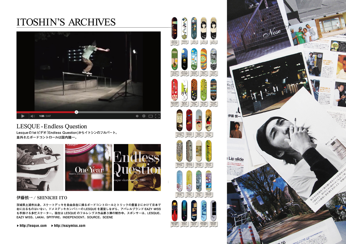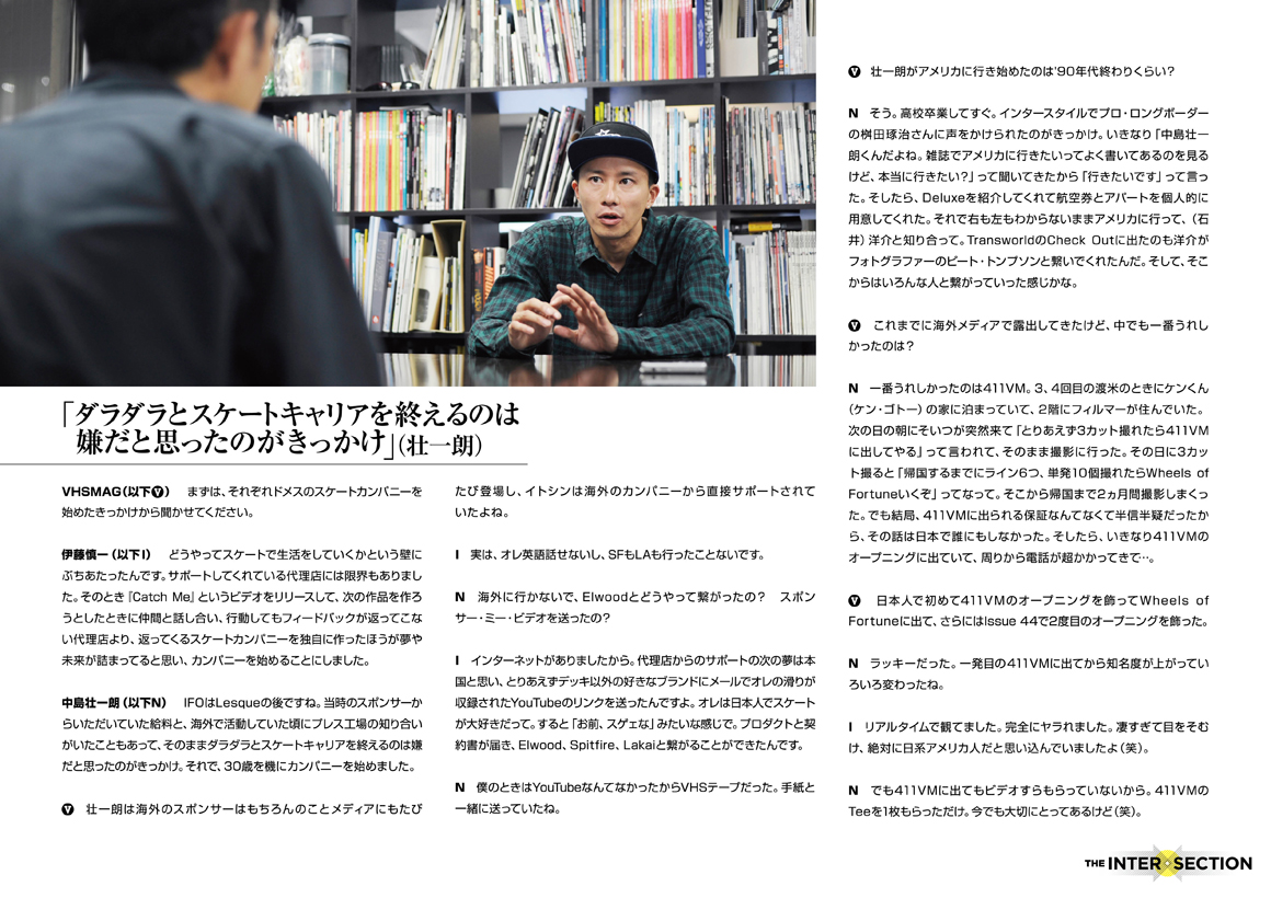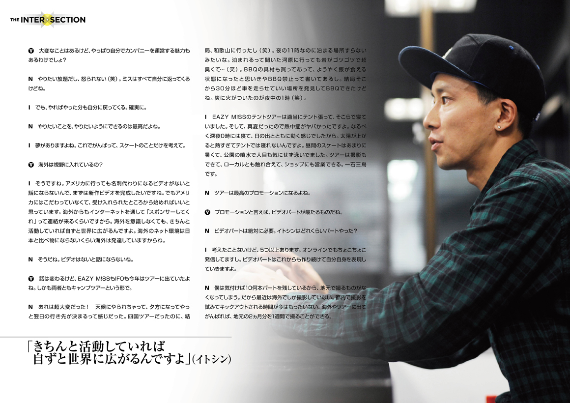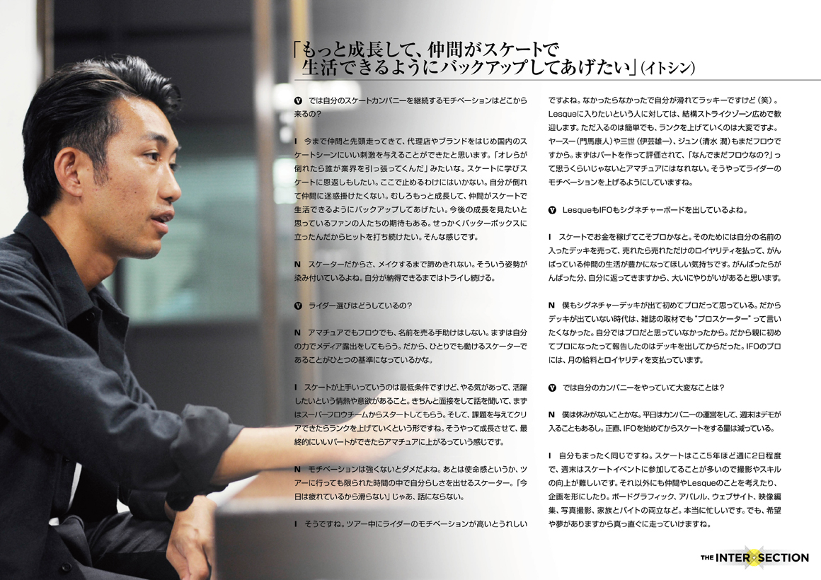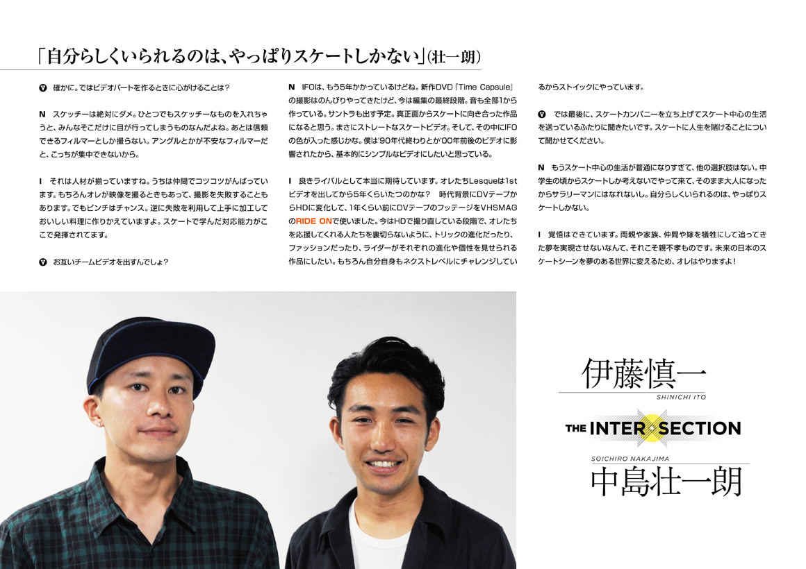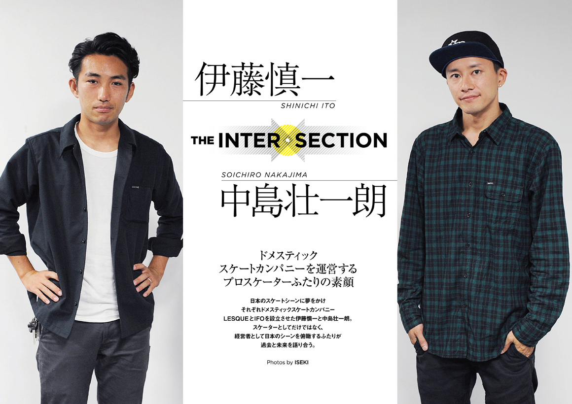 INTERSECTION ドメスティックスケートカンパニーを運営するプロスケーターふたりの素顔 ──SHINICHI ITO × SOICHIRO NAKAJIMA 2013.11.20 日本のスケートシーンに夢をかけ、ドメスティックスケートカンパニーLESQUEとIFOを設立させた伊藤慎一と中島壮一朗。スケーターとしてだけではなく、経営者としてシーンを俯瞰するふたりが過去と未来を語り合う。