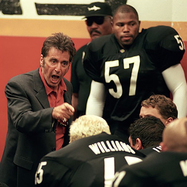 自分の場合、アル・パチーノのスピーチで萎えた精神を奮い立たせます。アル・パチーノの迫真の演技と言葉の力は圧巻。数々の出演映画で説得力抜群の名スピーチを披露してきた氏ではありますが、中でも『エニイ・ギヴン・サンデー』(’99)は格別。NFLのヘッドコーチ(アル・パチーノ)がプレーオフ出場をかけた天王山ともいえる大一番を前に、選手を叱咤激励するシーンは鳥肌 実もの。どんなにローテンションでもこの場面(本編観ないと意味ないかも)を観ればたちまちドーパミン噴出ライカ華厳の滝。おっと、興奮しちゃいました(失敬)。