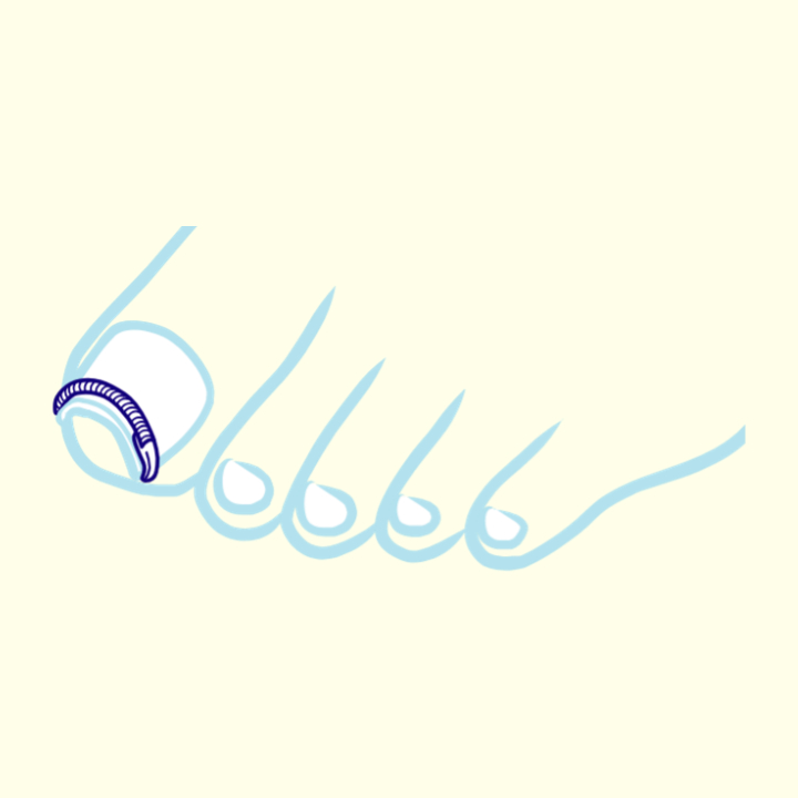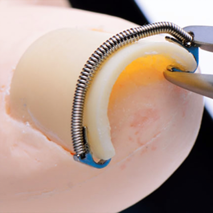 病院で爪にシリコンチューブをはめて食い込みを防ぐ治療、テーピングで爪縁皮膚を引きおろす方法などを試してみたのですが根本的解決には至らず。悩んだ末に、皮膚科の先生にオススメされていた金具を付けて矯正する治療法(自由診療=自費)を試してみました。