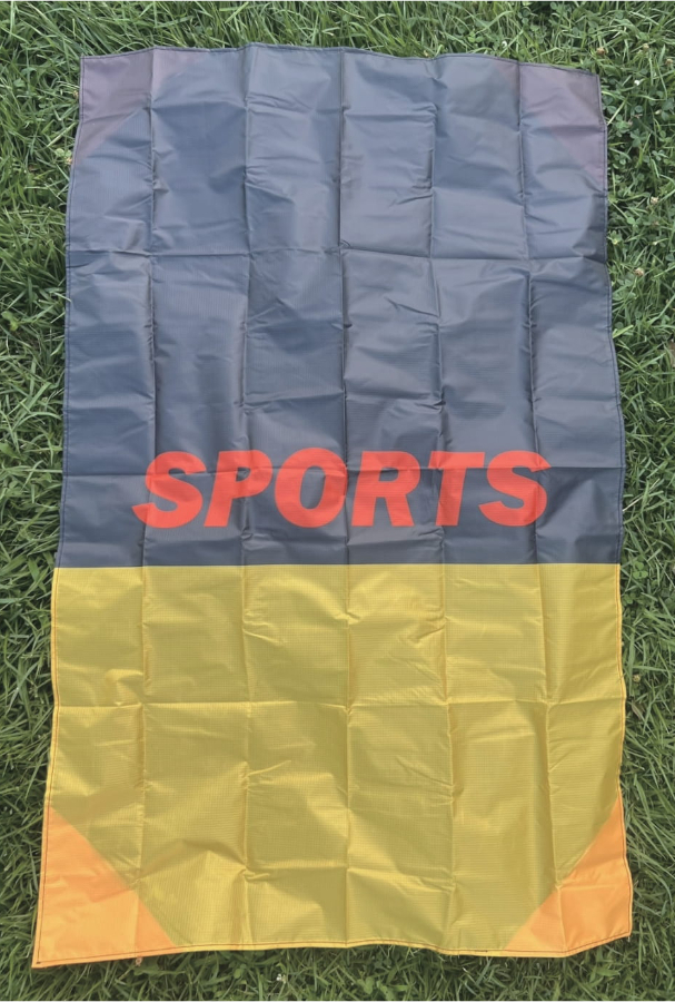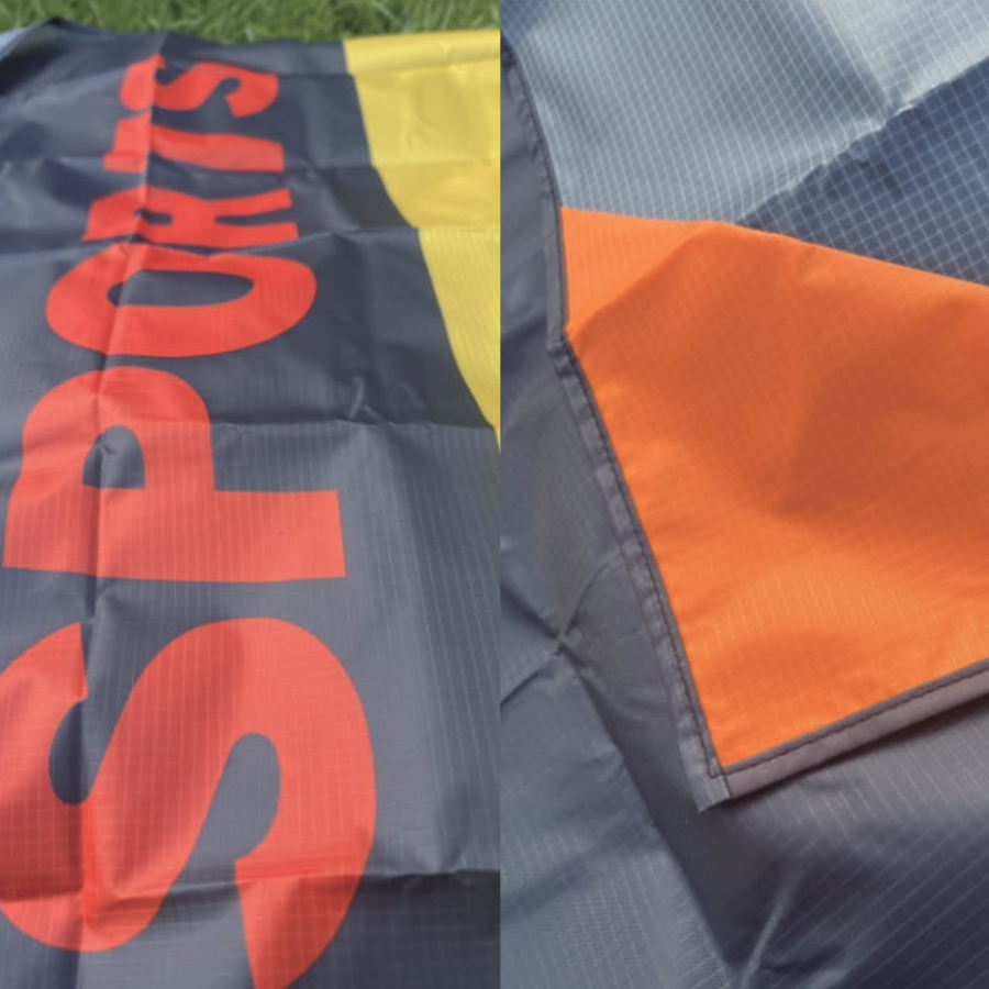 レインコートなどにも使用される薄くて軽い高耐水ポリエステルのレジャーシート。折りたたんで収納可能な携帯袋つき。Ground Sheet