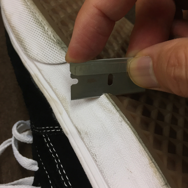 それはまだ、自分が“飽くまでも”を“悪魔でも”と勘違いしていた頃、新調したばかりのシューズを投げたり擦ったり炙ったり言葉責めしながら、なんとか足に馴染むよう悪戦苦闘していると、元祖TMCの主であったM氏が「カッターでエッジを削って数箇所切れ目いれればすぐ柔らかくなるよ」と。が、が〜ん! それはまさに青天の霹靂といいますか、そんな単純なことに長年気がつかなかった自分の無知とパイセンの知恵にW衝撃を受けたのであります。早速実践すると、これはこれは調子いいではありませんか。鰹節を削る要領でエッジをシュッシュッとやったあとに切れ目をザクザクと入れると、役所の人間の頭のように硬かったキックスが、Fカップのボニョにょーんのような触り心地に。こ、これぞスケーターウィズダムというか今で言うところのストリートスマート。いや〜パイセン半端ない繁華街。