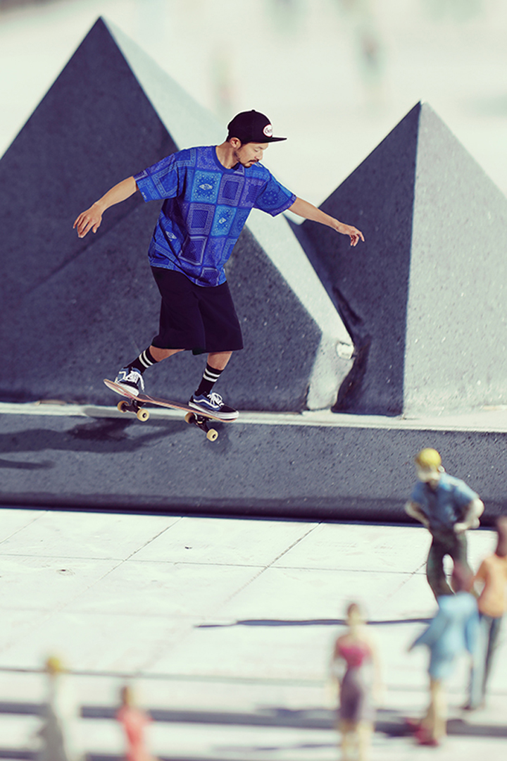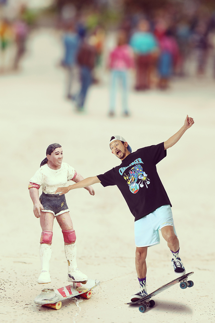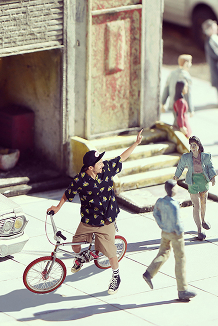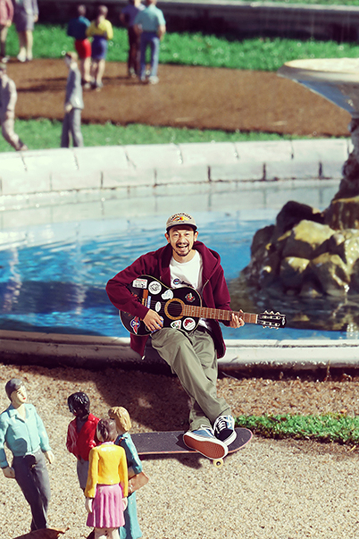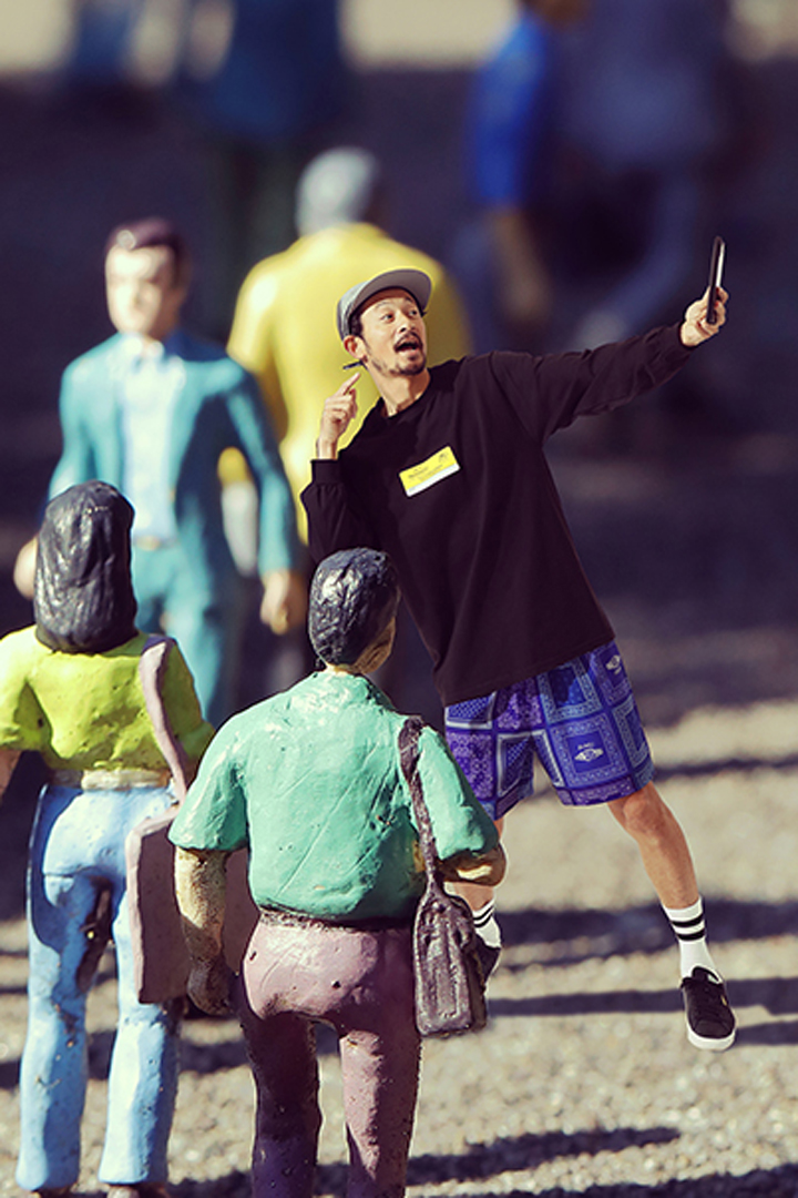 ミニチュアパークを背景に撮影して旅行気分を演出。
