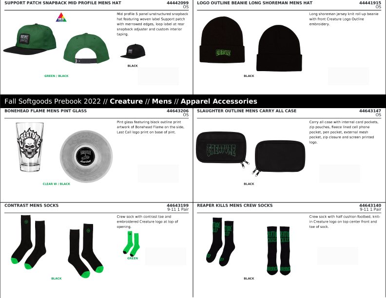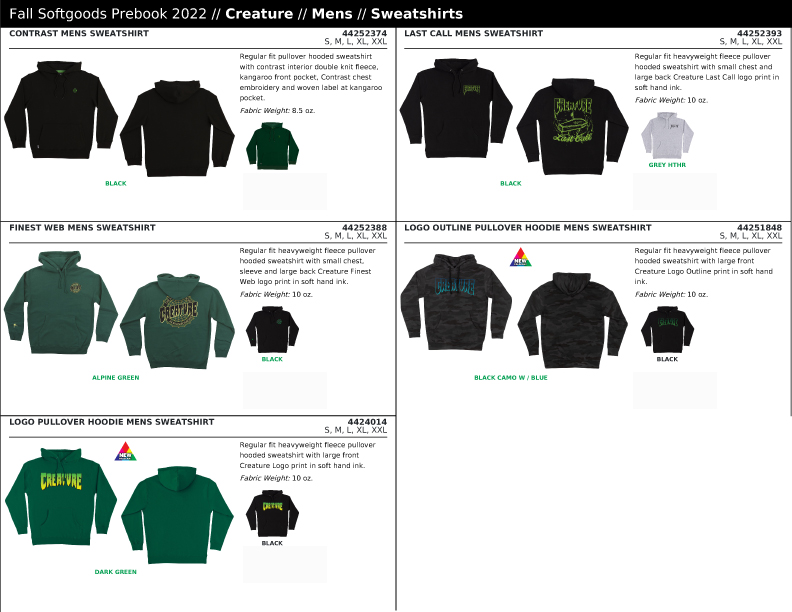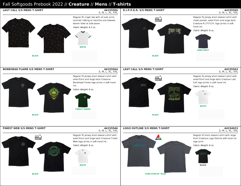 LOOKBOOK ヘッシュ野郎必見 ──CREATURE - FALL 2022 APPAREL 2022.11.02 冨川蒼太も所属するCreatureの秋物最新カタログ。 アイテムの配色もブラック&グリーンで決まり! Hasco Enterprises / www.hasco.co.jp