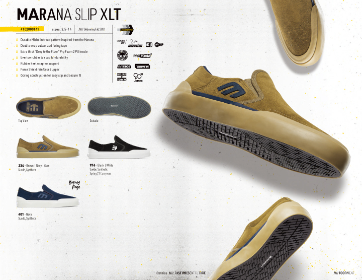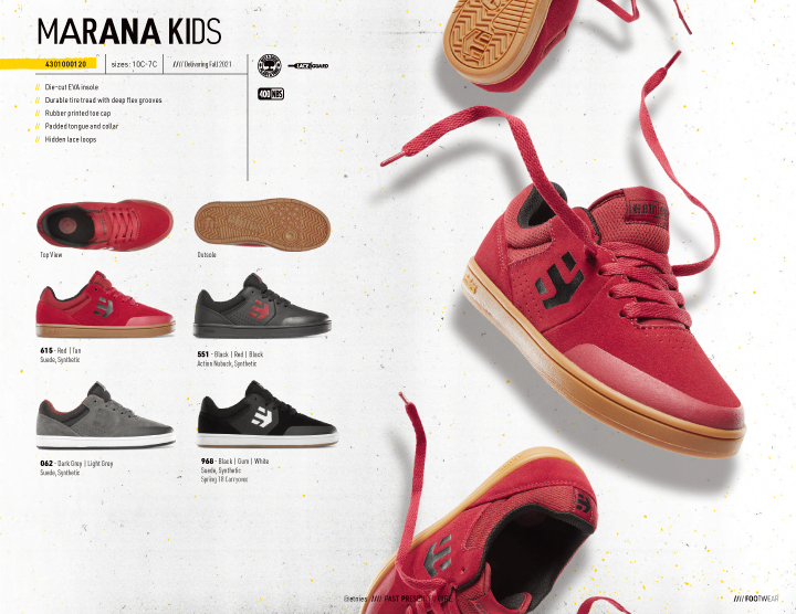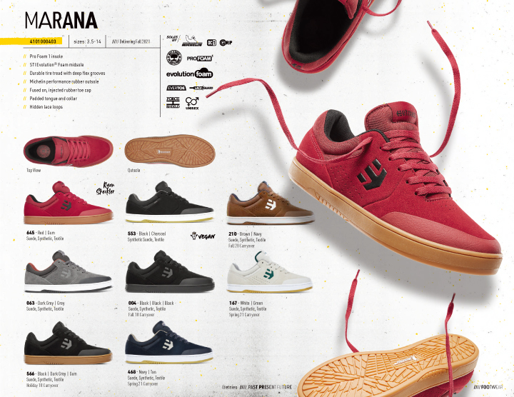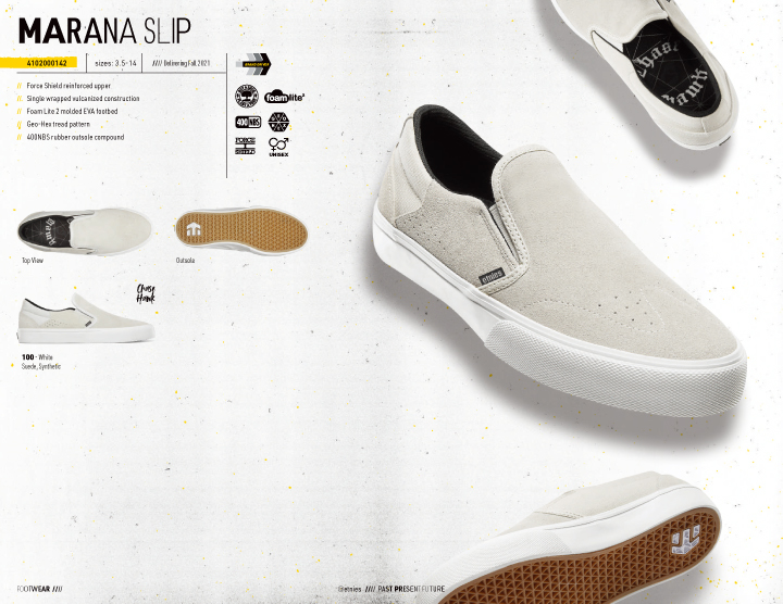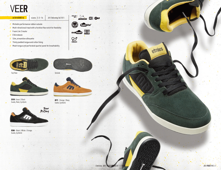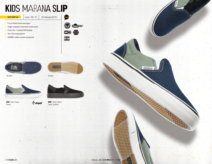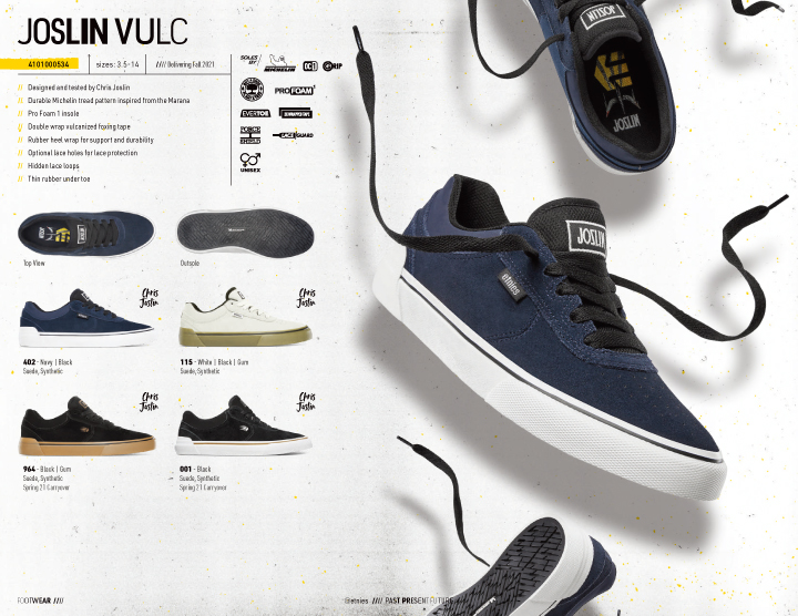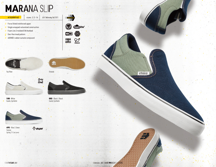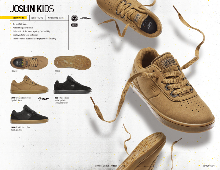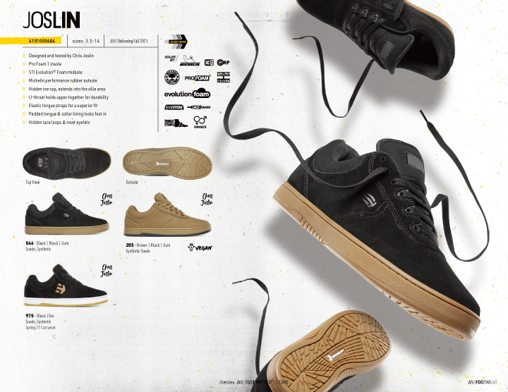 LOOKBOOK スケーターの足元を支えて35年 ──ETNIES - FALL 2021 2021.08.12 Joslinを筆頭に、スリッポンやキッズモデルも充実。 落ち着いた配色で魅せるetniesの最新カタログ。 Sonik Distribution / www.sonik-dist.com