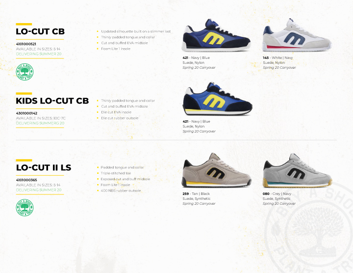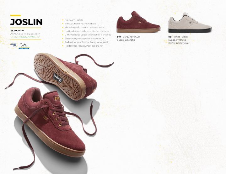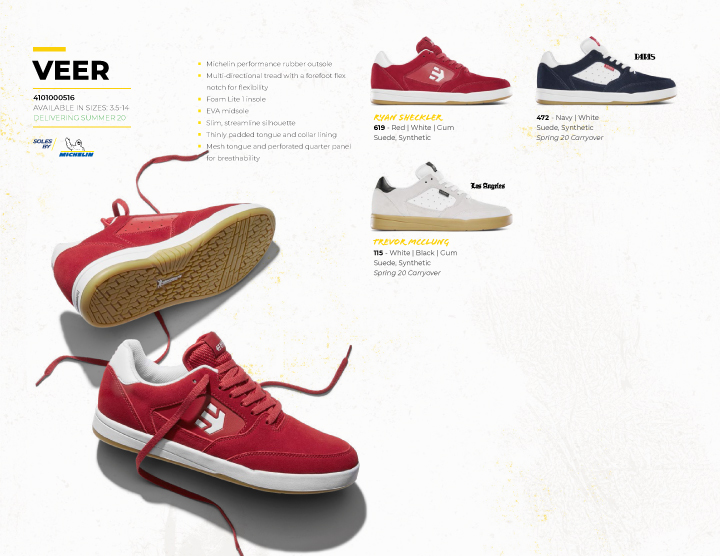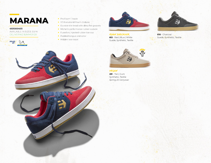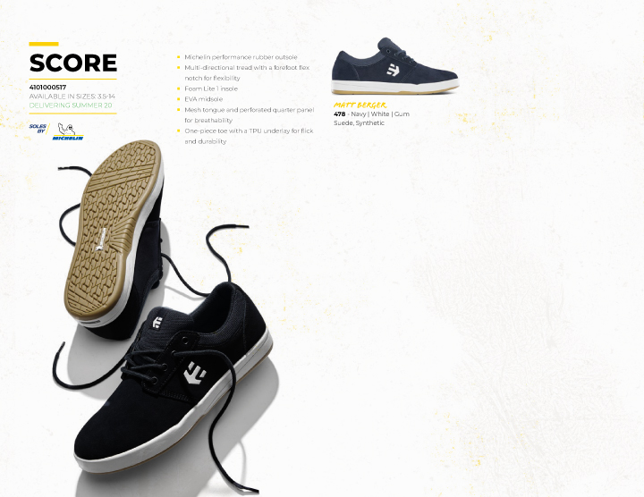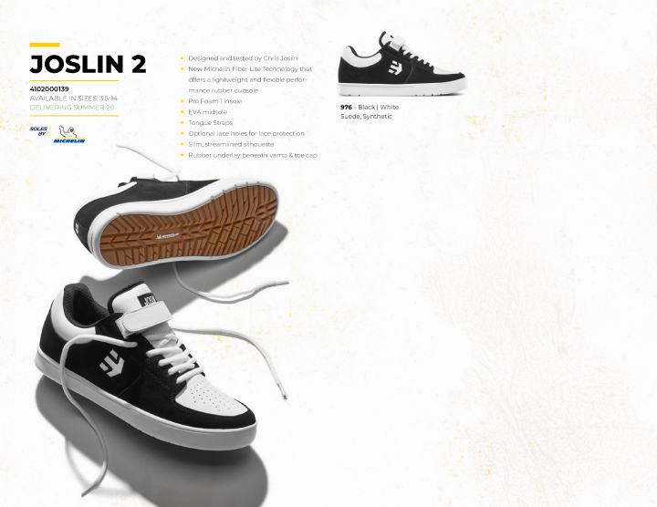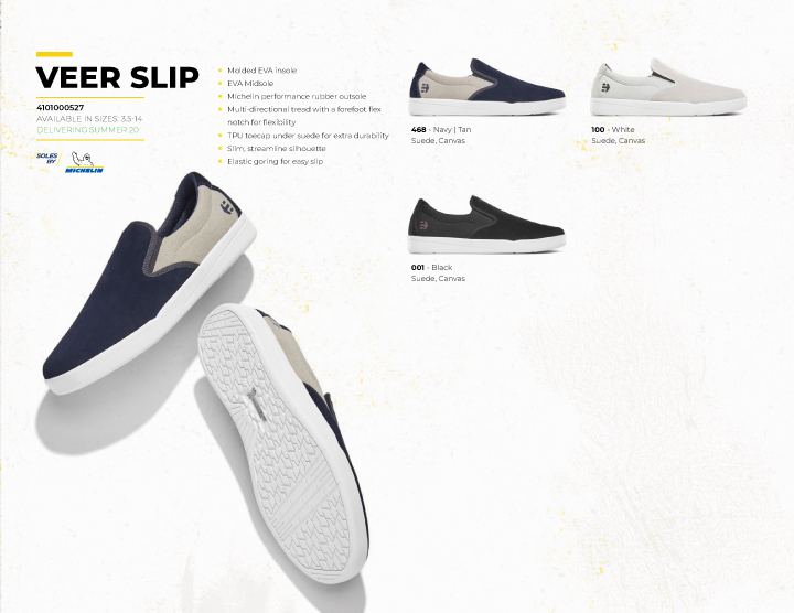 LOOKBOOK ミシュラン3つ星スケシュー ──ETNIES - SUMMER 2020 2020.05.07 Michelinソールを搭載したスリッポンもお披露目。 元祖スケートシューズブランドの夏物最新カタログ。 Sonik Distribution / www.sonik-dist.com