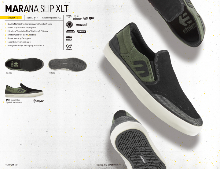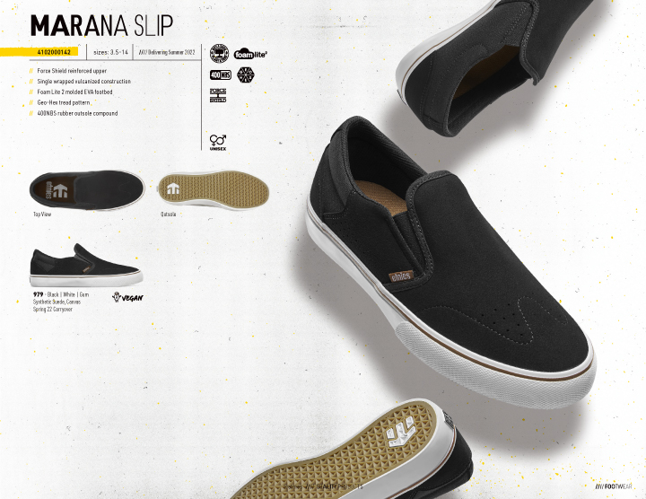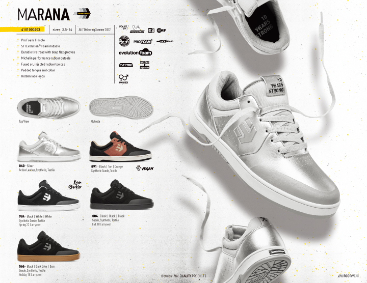 LOOKBOOK MARANA 10周年! ──ETNIES - SUMMER 2022 2022.06.16 ブランドを代表するMaranaがリリース10周年。 シルバーの記念モデルも目を引くetniesの新作カタログ。 Sonik Distribution / www.sonik-dist.com