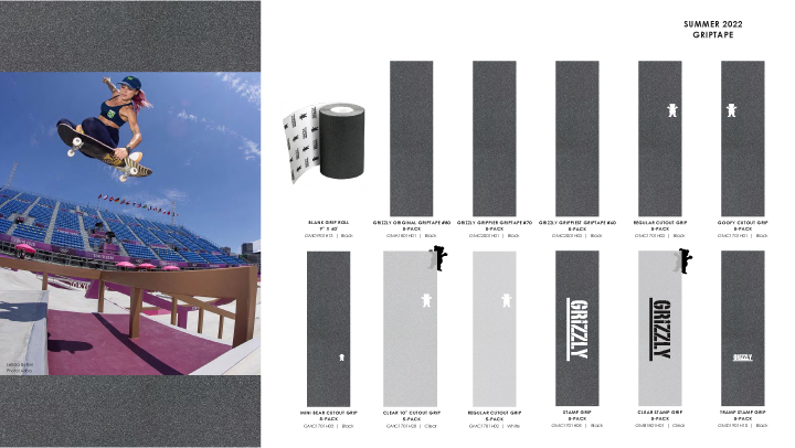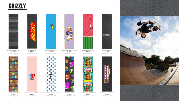 グリップテープを中心に、デッキからアパレルまで幅広く展開。